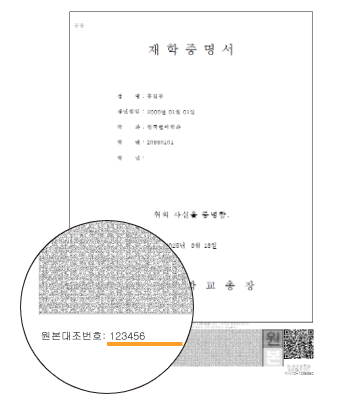 • 발급된 문서하단에 2차원 바코드가 출력된 증명서인 경우 바코드 검증 프로그램으로원본대조 할수 있습니다